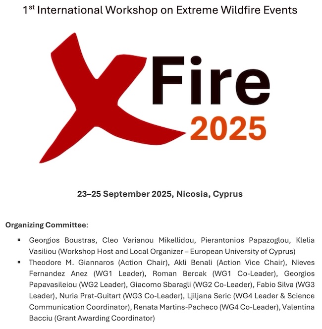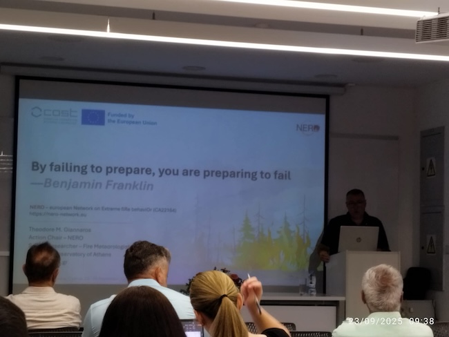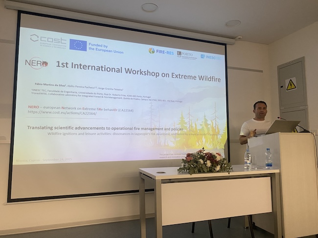 Od 23. - 25. rujna 2025.g. održana je na Cypru u organizaciji Europske mreže za ekstremno ponašanje požara (CA22164 - european Network on Extrime fiRe behaviOr - NERO) Prva međunarodna radionica o ekstremnom ponašanju požara raslinja (1st International Workshop on Extreme Wildfire Events). Na radionici je s prezentacijama sudjelovala i mala delegacija iz Hrvatske. Osim prof.dr.sc. Ljiljane Šerić sa FESB-a, članice upravljačkog odbora i komunikacijskog koordinatora projekta NERO, u hrvatskoj delegaciji su sa FESB-a bili prof.emer. Darko Stipaničev i asistentica Antonia Bartulović, univ. mag. ing. comp., te dr.sc. Ivana Čavlina Tomašević iz DHMZ-a.